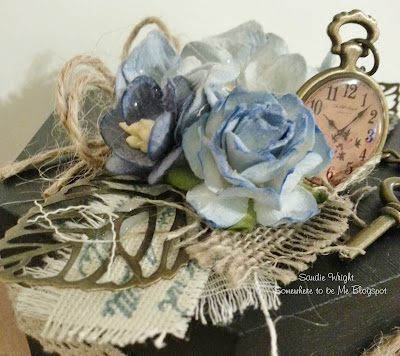 For the top,I just layered that up with some burlap, lace,a strip of fabric, brass leaves and flowers and another string bow.